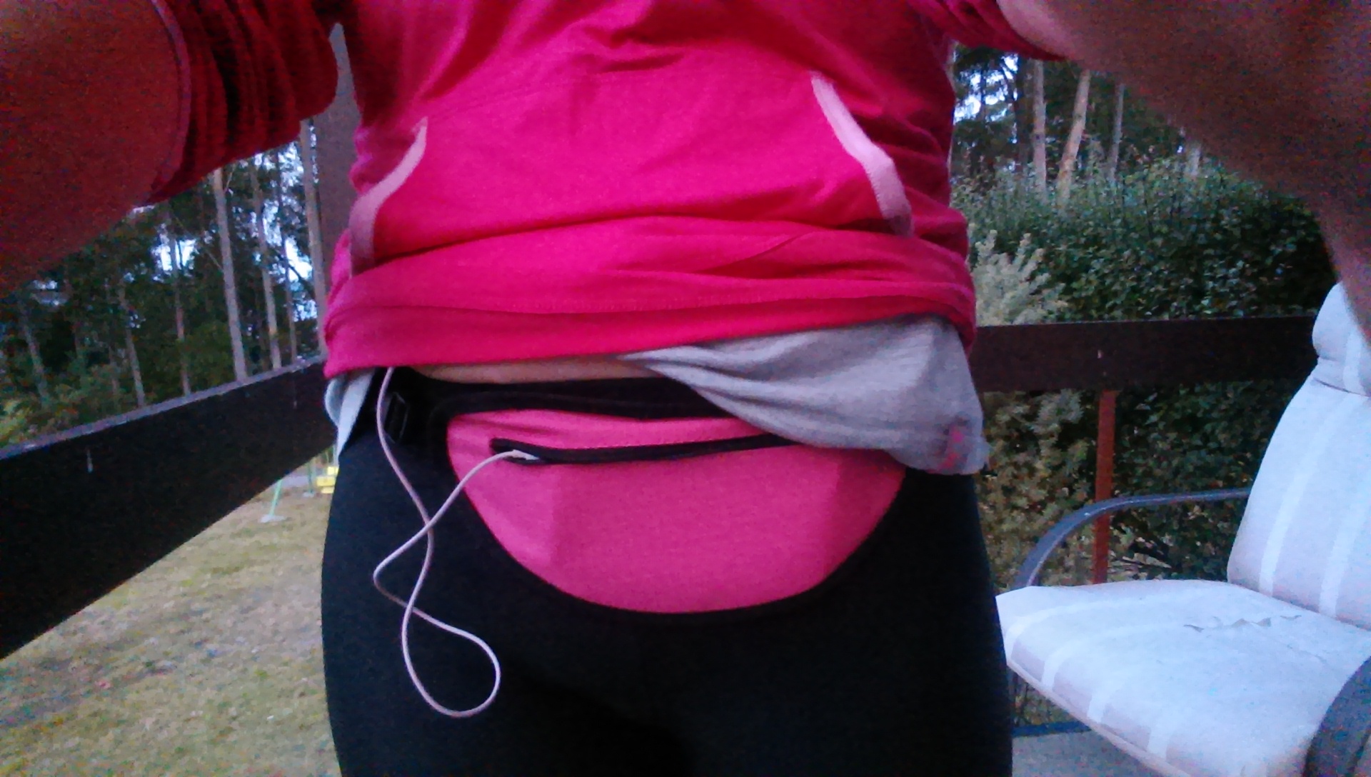 In my local cheapo shop the other week I pass a rack that has fitness items on it. One of those items was a bumbag (nasty term that one) or the extremely cheap version of what I am after. For $4 I figure I’ll give it a go for a couple of months and see what happens. I tested it out, and it works a treat. Both my phone and iPod fit in it, it didn’t bounce around, the waist was expandable so it fit, and it was comfortable. As you can see from the photo, it is barely noticeable under my top. Not some great chunky thing.