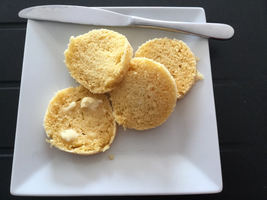 4 ingredients. 1 minute mixing. 90 secs in the microwave. Cut, toast – or not – and eat.